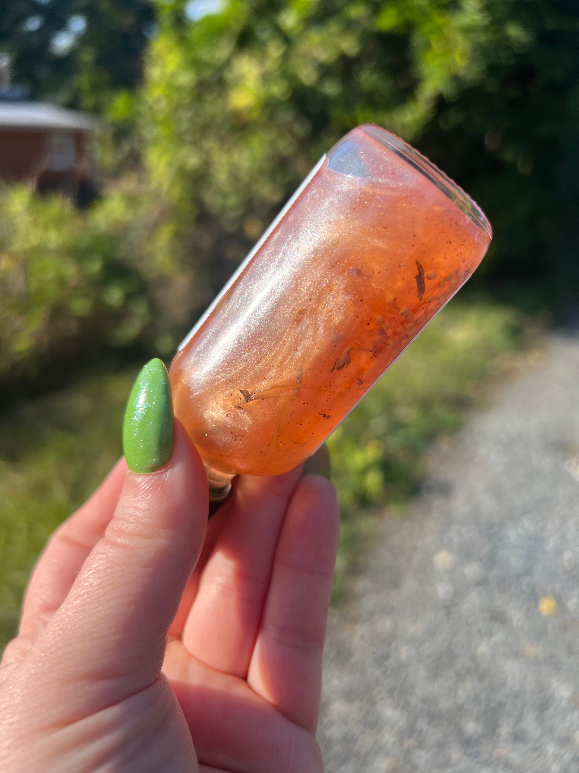 Ingredients: sweet almond oil, an herbal blend, essential oil blend, fragrance oil blend, mica powder, and crystal chips.